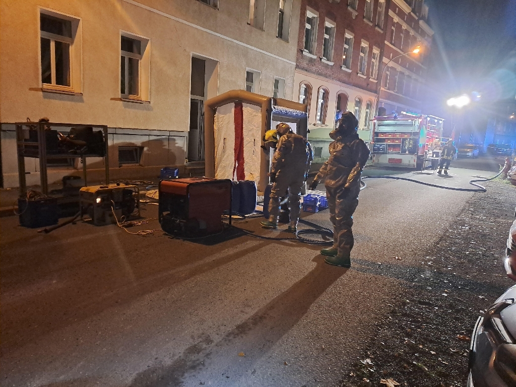 Nachdem parallel durch die Feuerwehr Weida die Dekontaminationsstrecke aufgebaut war ging es für unseren Trupp in das Wohnhaus vor. Zuerst wurde so die Lage erkundet und verschiedene Messungen im Gebäude und der betroffenen Wohnung durchgeführt. Nachdem dies geschehen war wurden die betroffenen Personen und ein Hund aus der Wohnung zur Dekontamination gebracht. Hier wurden sie in der Strecke geduscht und anschließend in ärztliche Obhut gegeben.